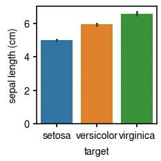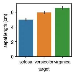 sns.barplot(data=iris, x='target', y='sepal length (cm)', fc='C0')
