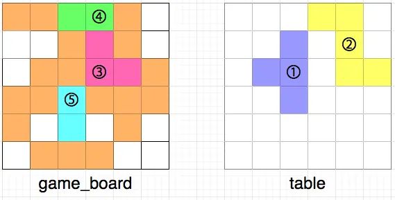 위 그림에서 왼쪽은 현재 게임 보드의 상태를, 오른쪽은 테이블 위에 놓인 퍼즐 조각들을 나타냅니다. 테이블 위에 놓인 퍼즐 조각들 또한 마찬가지로 [상,하,좌,우]로 인접해 붙어있는 경우는 없으며, 흰 칸은 퍼즐이 놓이지 않은 빈 공간을 나타냅니다. 모든 퍼즐 조각은 격자 칸에 딱 맞게 놓여있으며, 격자 칸을 벗어나거나, 걸쳐 있는 등 잘못 놓인 경우는 없습니다.