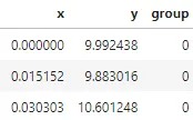 이 경우에는 line들의 분포를 나타내는 그림을 그려보는 것도 좋다. 이를 위해서 seaborn의 도움을 받아서 그리면 편한데, 데이터를 dataframe 형태로 구성하기만 하면 된다. 이때 각 선이 속하는 group에 대한 정보가 필요하다. 여기서는 group이라는 컬럼에 그 정보를 담아두었다.