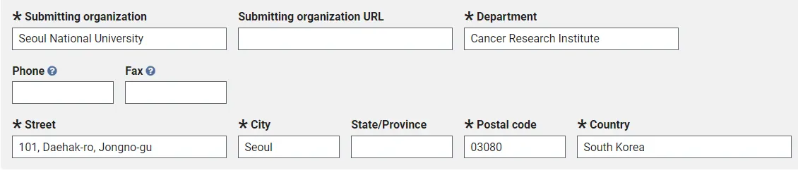 Submitter는 내 정보, Submitting organization은 서울대학교 암연구소로 함.
