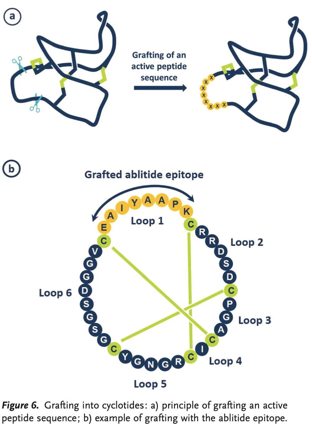 구조적으로 안정적인 cyclotide loop을 골격으로 두고, 일부를 bioactive 한 (e.g., Target과 결합한다고 알려진) 아미노산 서열로 치환함. (Grafting의 개념)