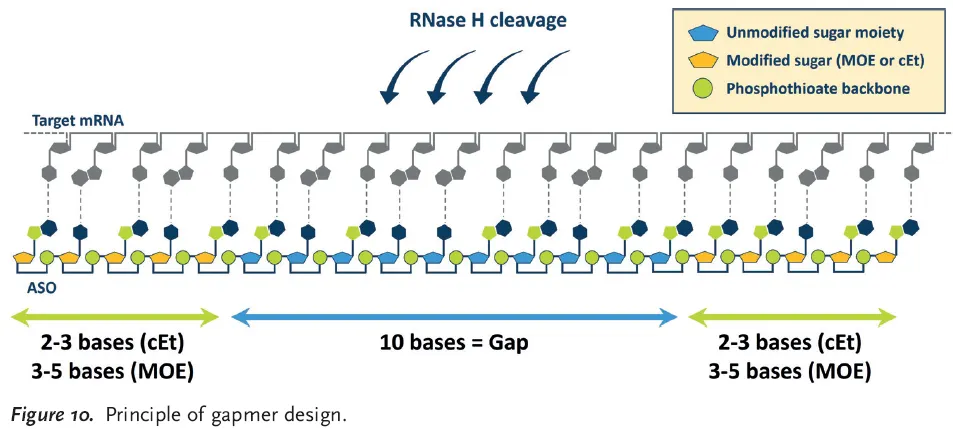 반면 central gap 지역의 nucleotide는 unmodified sugar를 가져서, RNase H가 이 지역을 target 하여 mRNA를 분해할 수 있도록 한다. | |