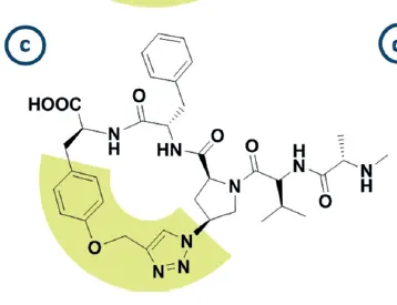 e) RCM을 활용해서 동시에 2개의 macrocycle을 만드는 방법은 regioselectivity를 유발하여 문제가 있다. (선호되는 지역이 있겠지만, 어디에 cycle이 만들어질지 모르고 확률적으로 만들어짐.) 대신 orthogonal한 두 개의, ring-closing alkyne and olefin metathesis를 활용해서 bicyclic peptide를 만듦으로써 이를 해결함.