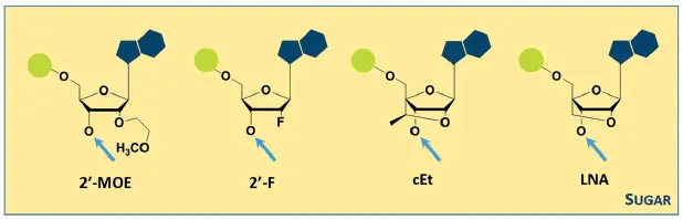 Gapmers | ASO의 일종. 양쪽 끝의 nucleotide sugar 2번 탄소들은 변형되어 있어 nuclease에 의해 잘 분해되지 않는다.