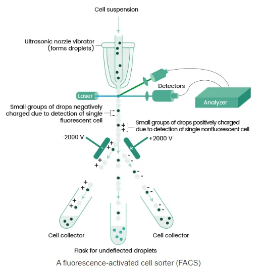 여러 종류의 cell들의 혼합액의 flow를 가지고 개별 cell의 fluorescence intensity 를 측정. fluorescent cell과 nonfluorescent cell에 각각 반대 종류의 전하를 걸어줘서 fluorescent cell과 nonfluorescent cell을 서로 다른 cell collector로 분류.
