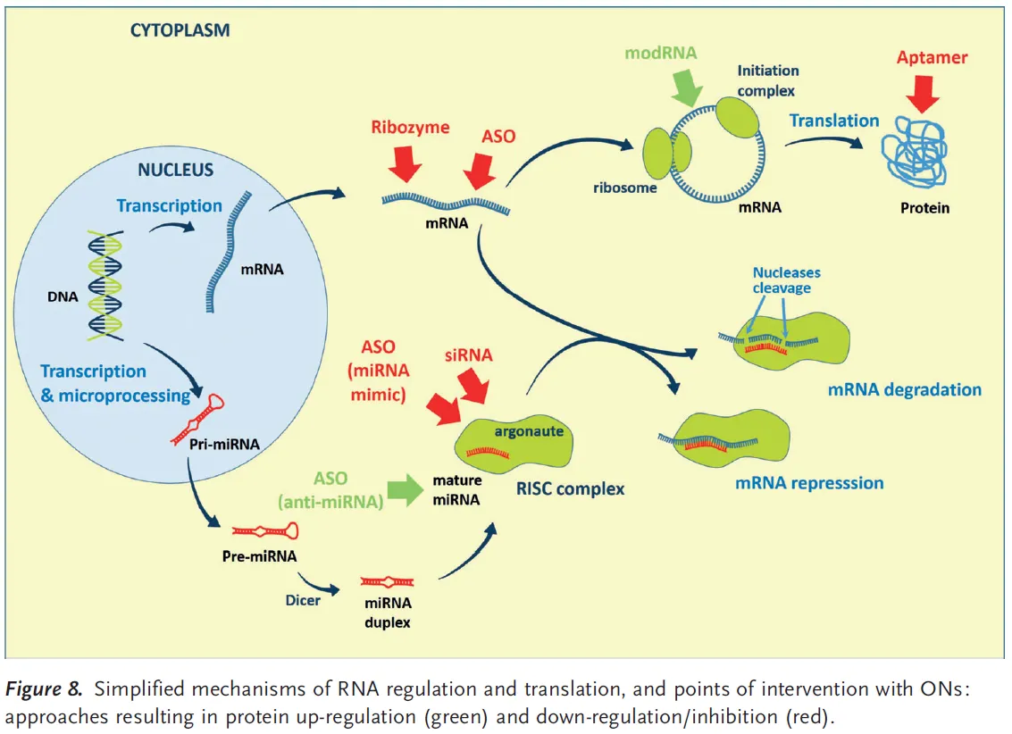 ON의 종류로는 ASO, siRNA, ribozyme, aptamer, modRNA 등이 있다.