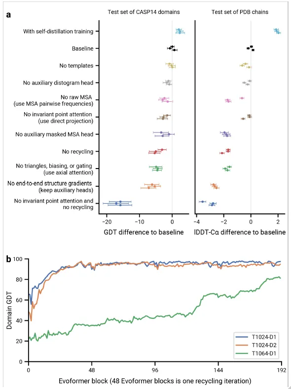 Fig 4a,b. (a) Ablation experiment. (b) Recycling의 필요성. 1cycle = 48 blocks.