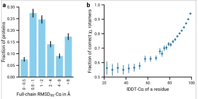 Fig 2a,b. (a) Overall median RMSD = 1.86Å. (b) Residue 위치 예측이 정확할수록 (backbone frame) atom torsion angle 예측이 정확해짐을 알 수 있다.