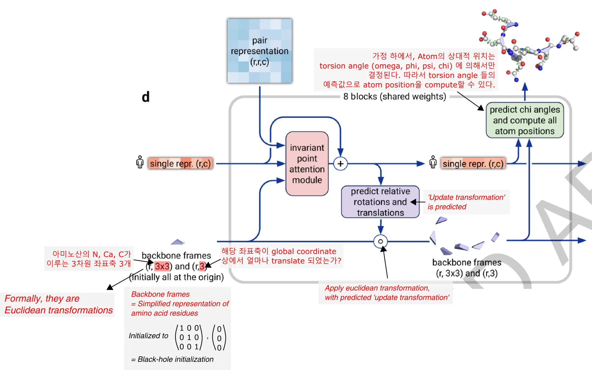 Residue의 orientation과 position은 (회전변환, 평행이동) 을 나타내는 ( 형태의 Euclidean transformation 으로 나타낼 수 있다. 처음에는 모든 atom이 identity transform으로 initialize 되며 (모든 residue가 한 점에 모여 있어서 'black-hole initialization'이라고 부른다), 이후 iteration을 돌면서 residue의 위치와 orientation을 update하는 'Update transformation'을 MSA single representation으로부터 예측, 이를 기존 transformation에 반복적으로 적용해나가면서 residue 수준의 structure를 update하는 것이다. Residue 수준의 structure가 결정되면, atom 수준의 position은 torsion angle에 의해서만 결정된다고 본다. (Rigid-body assumption에 의해서) 따라서 MSA single representation으로부터 atom의 torsion angle들 또한 예측하여 atom의 position이 예측될 수 있는 것이다.