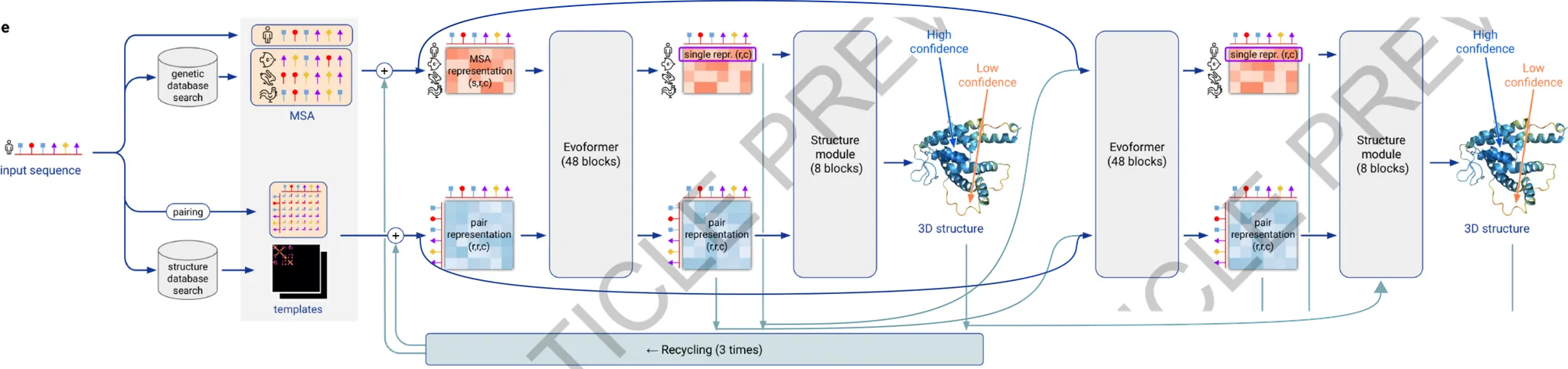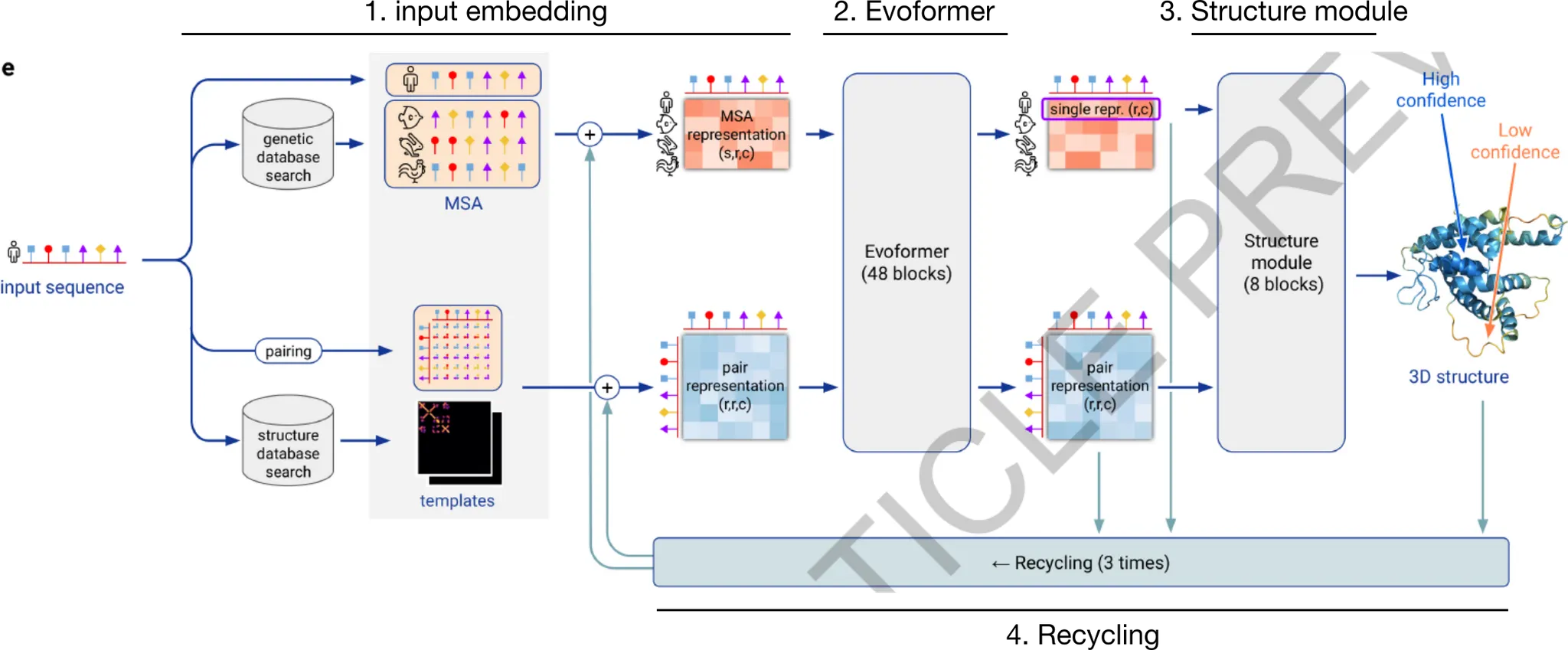 이를 직관적으로 해석하자면 다음과 같다. 크게 보면 (1) input sequence와 evolutionary relationship을 보이는 다른 종의 sequence 정보(MSA의 형태로)를 이용하고, input sequence의 구조 예측에 도움을 줄 수 있는, 이미 알려진 protein structure template를 이용하여 input sequence가 나타내는 3D structure를 예측하고자 한다. 그 과정에서 (2) Evoformer는 MSA embedding과 residue pair embedding의 self-attention update와 더불어, 서로 간의 information exchange를 거듭하며(x48회) embedding을 update하고, (3) Structure module에서는 Evoformer의 결과로 나타난 embedding들을 이용하여 structure를 예측한다. (4) 한편, 추가적인 성능 향상을 위해서 MSA와 pair representation, 그리고 예측된 protein structure를 다시 활용하여 새로운 예측을 하는 방법으로 prediction의 refinement를 도모한다 (recycling).