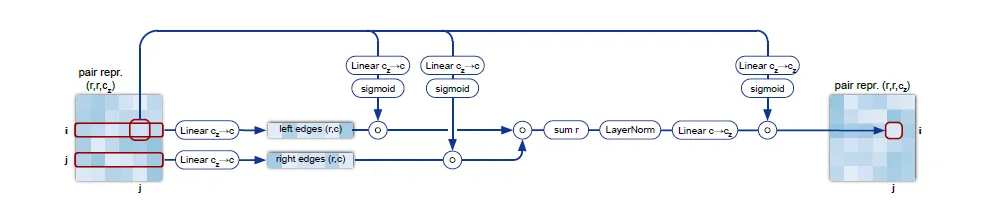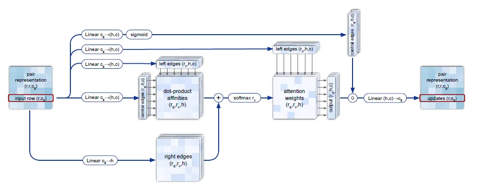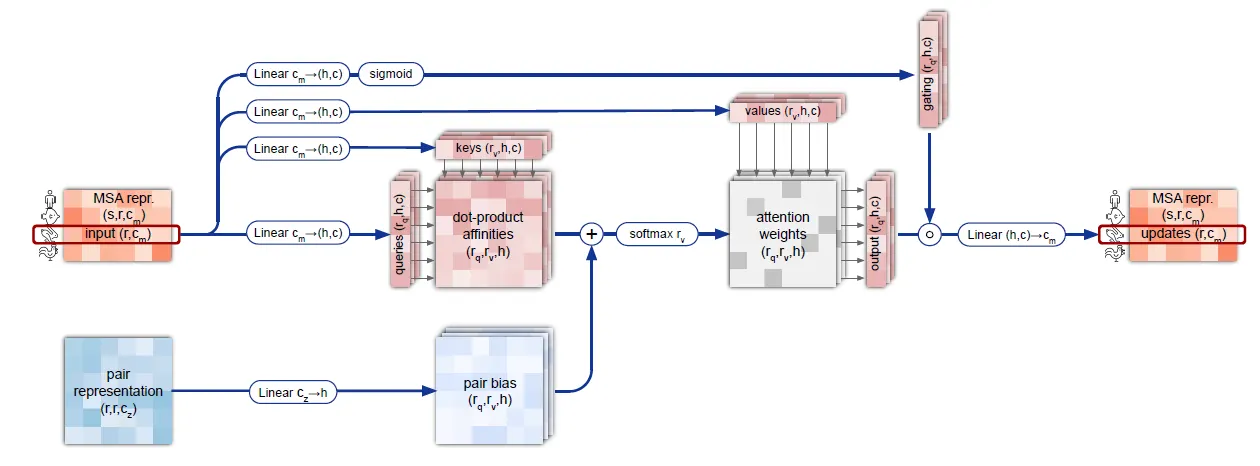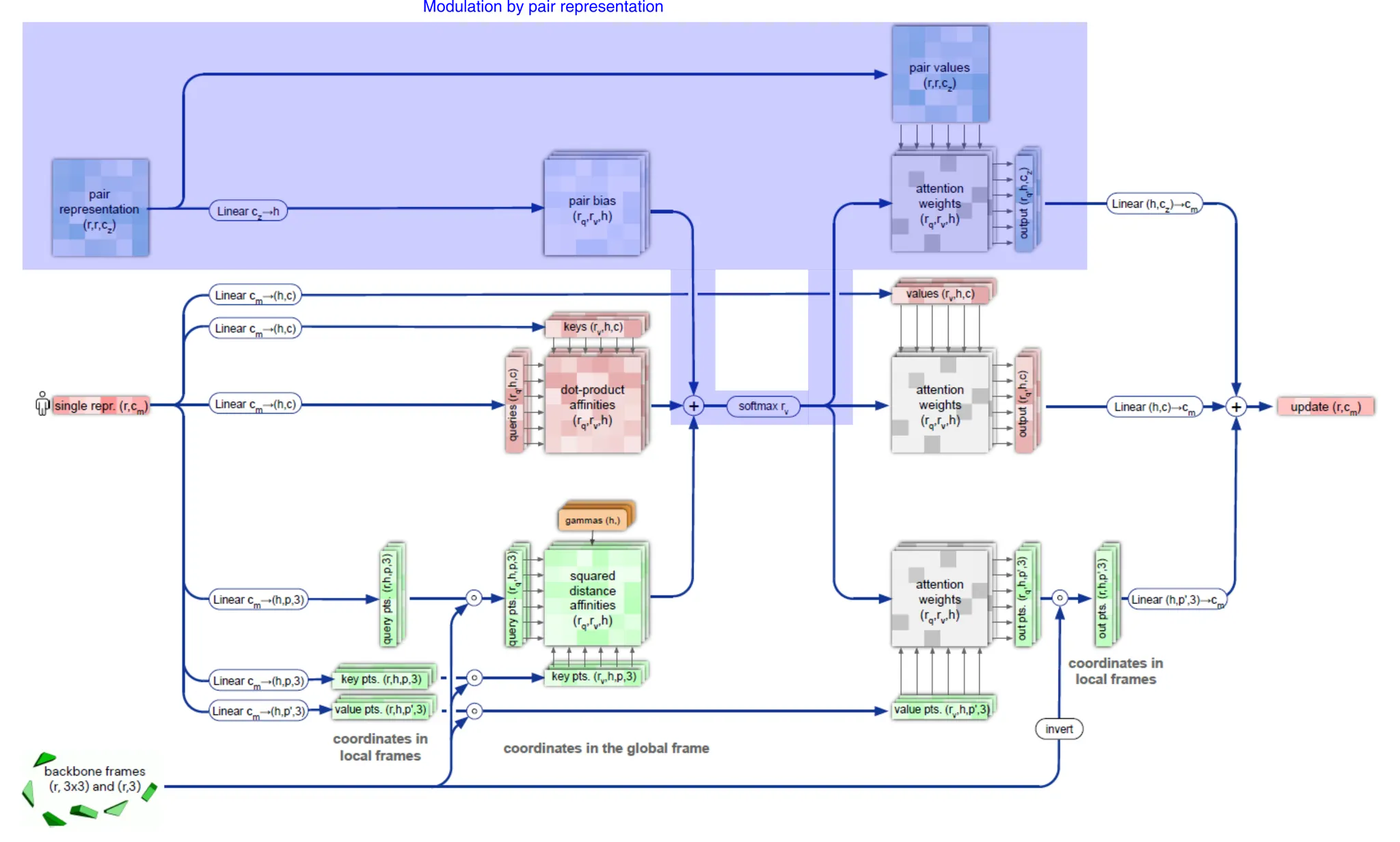 (Modulation by pair representation) Pair representation을 scaled dot-product로 생각하여, Softmax 직전에 bias term으로 추가해줄 수 있다. (아래 그림, blue highlight)