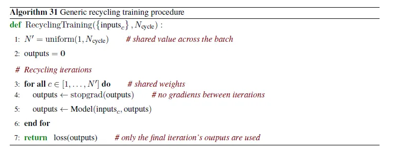 Training 시의 recycling 방법. 마지막 iteration의 gradient만 살아남는다는 것과, Line 1에 의해 같은 input이라도 recycling cycle 수가 random하게 매 batch마다 달라진다는 점에 주목하자.