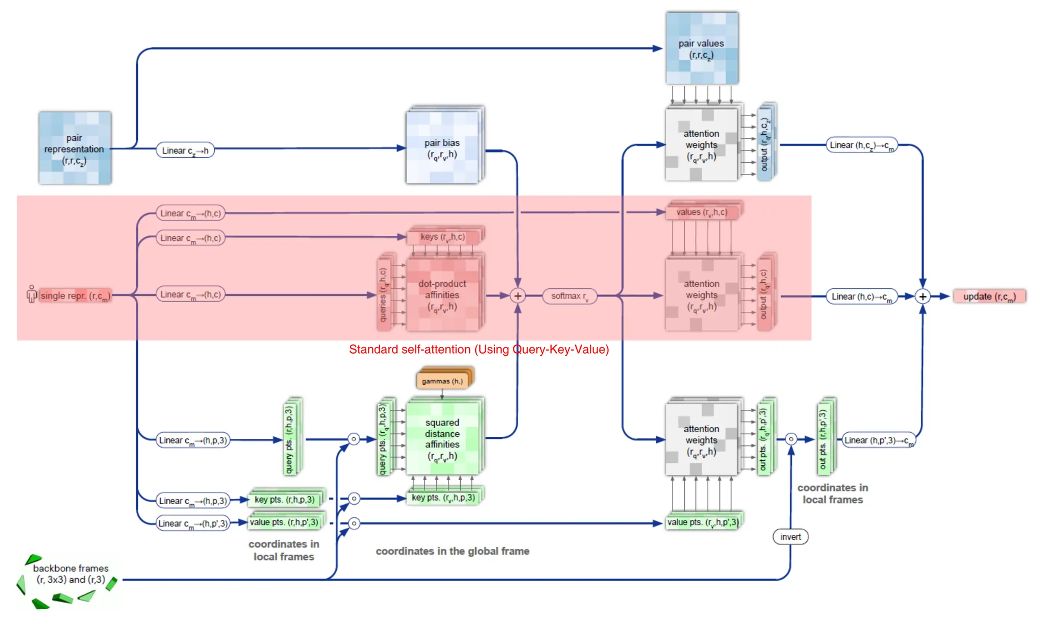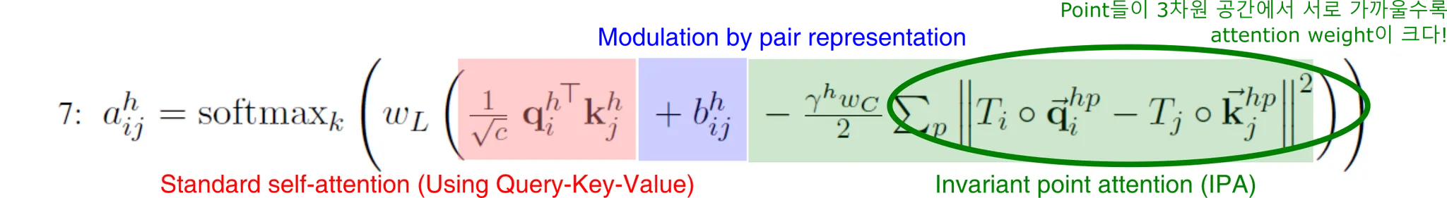 이 과정에서, MSA single representation은 invariant point attention module에 의해서 지속적인 self-attention update를 거치게 된다. 이 self-attention의 bias로서 pair representation이 사용되며, 현재까지 예측된 residue backbone frame의 위치 정보 또한 활용되어 3D space 내에서의 amino acid proximity 자체가 attention에 직접적으로 반영될 수 있게 한다.