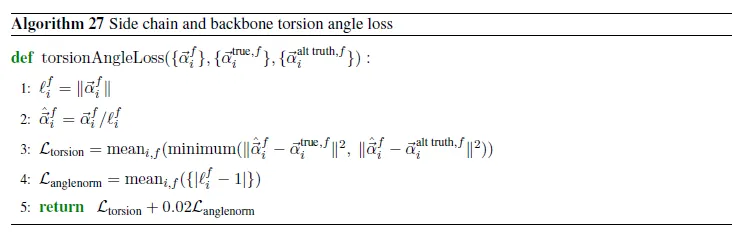 Atom의 torsion angle이 truth와 얼마나 비슷한지 측정하는 loss. 몇 가지 trick들이 적용되었지만 여기서는 다루지 않겠다.