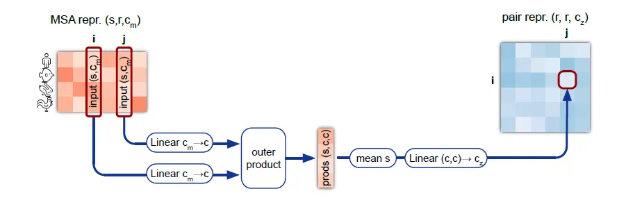 두 개의 residues 를 생각하자. 이 모듈의 목적은 두 residue 사이의 information을 어떻게든 반영한 self-attention을 통하여 single MSA representation을 update하는 것이다.