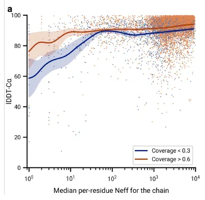 Fig 5a. MSA의 중요성. x축 → Effective한 MSA상의 sequence 개수. y축 → lDDT-Ca (backbone 예측에 대한 척도). Coverage = template coverage를 의미