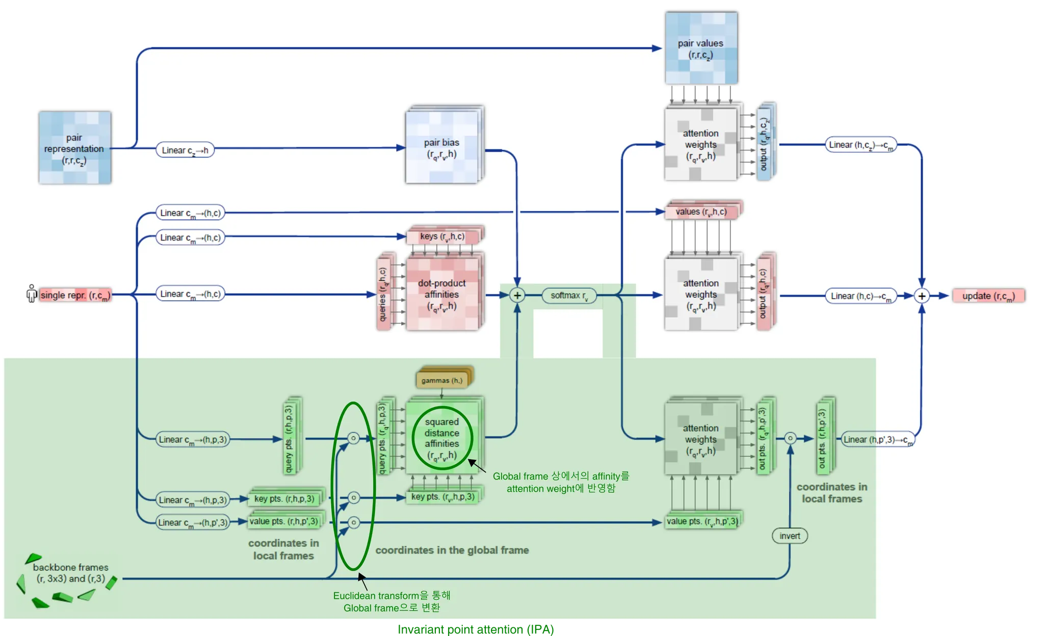 (Invariant point attention; IPA) Residue 의, 현재까지 예측된 3차원 상의 backbone frame 사이의 관계 (거리가 가까울수록, 보다 많은 관계성을 부여)를 self-attention 상에 반영할 수도 있다. (아래 그림, green highlight)