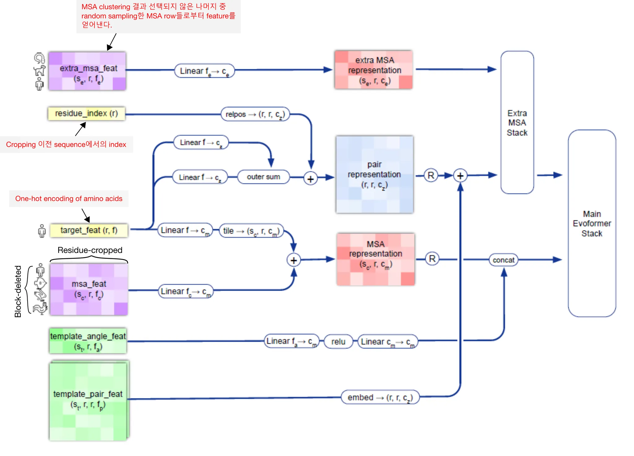 Main Evoformer stack으로 들어갈 input feature들을 준비하는 부분이다. Input amino acid sequence로부터 MSA representation (과 residue pair representation ( matrix들을 만들어내게 된다.