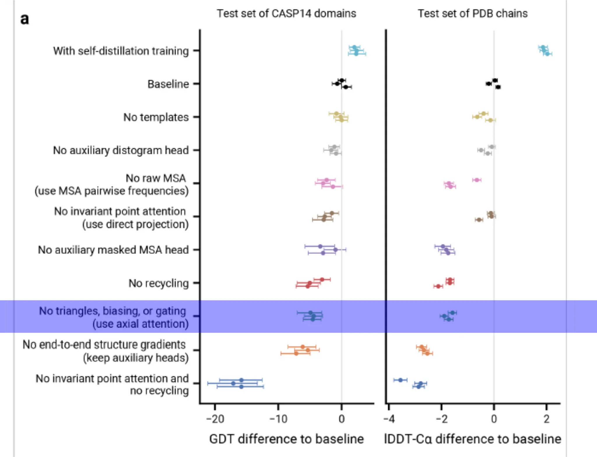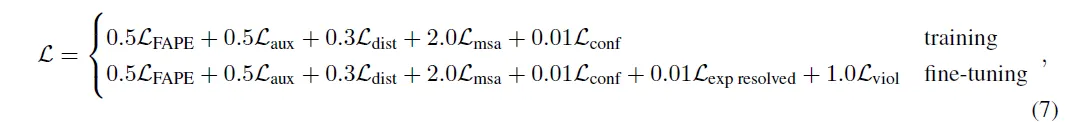 저자들이 언급하기로는, FAPE, aux, distogram, MSA loss의 경우에는 모델의 major subcomponent 각각에 대해서 해당 모듈이 만들어진 목적 그대로 학습이 잘 이루어질 수 있도록 individual loss를 추가해준 것이라고 한다. 이 loss들이 정말 다 필요할까? Ablation 해봤나?