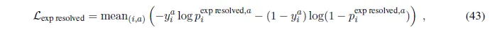 Atom의 위치가 high-resolution structure 내에서 experimentally resolve되었는지 예측하는 loss. Evoformer stack의 결과로 나온 MSA single representation 를 input으로 하여 atom-wise probability를 예측한다. Target은 High-resolution X-ray crystal과 cryo-EM structure (resolution <3Å) 결과로 residue 내의 atom이 resolved된 경우 1, 아닌 경우 0.