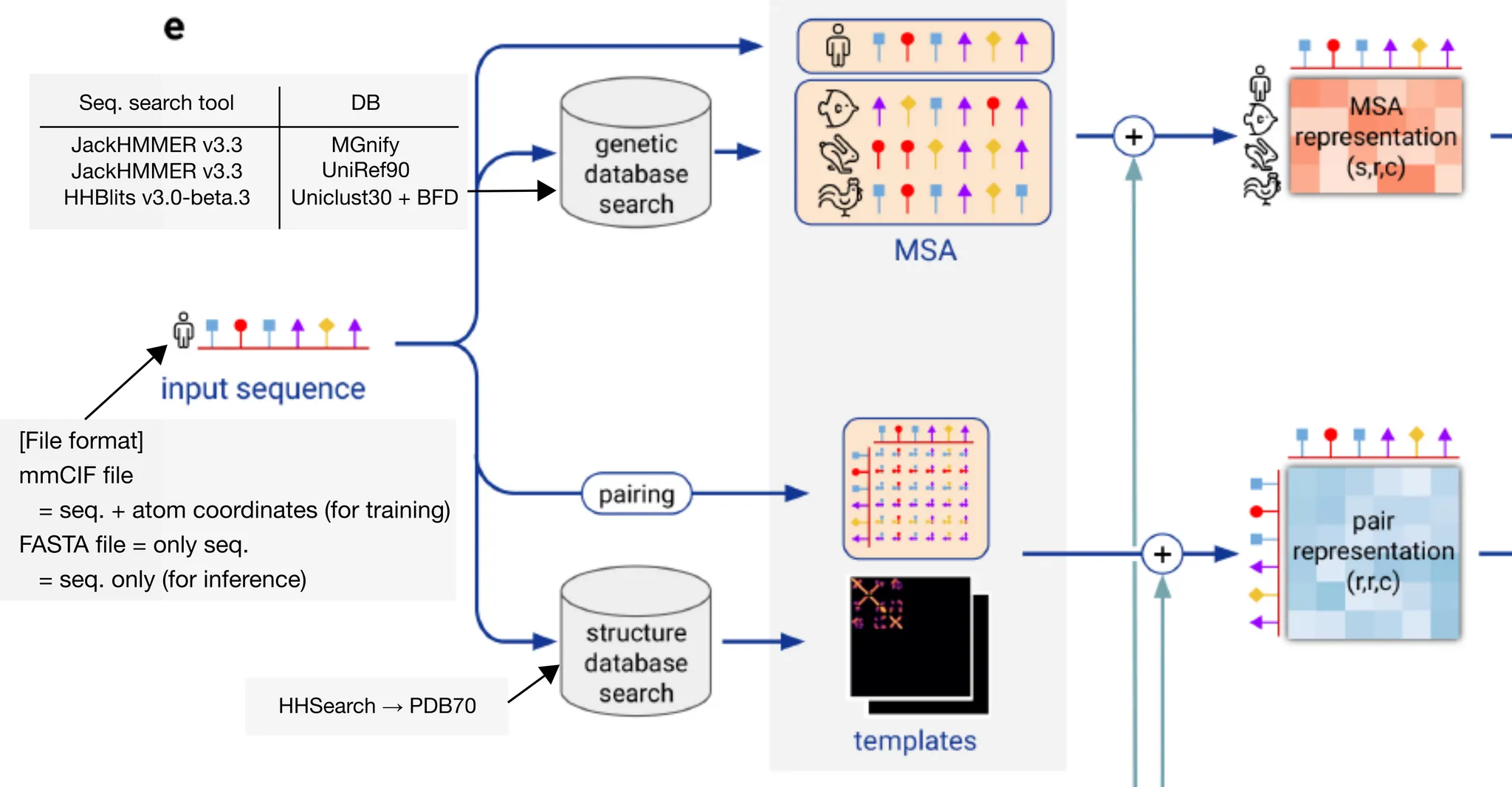 Input amino acid sequence가 들어오면, 가장 먼저 JackHMMER와 HHBlits를 이용하여 sequence DB에 검색을 수행한다. 그 결과물로 sequence들의 multiple sequence alignment(MSA)를 얻는다 (Genetic search). 다음으로, UniRef90 search 결과로 얻은 MSA를 이용하여 PDB70 데이터베이스를 HHSearch 를 이용하여 검색, residue 일부와 matching되어 structure에 대한 힌트를 제공하는 template를 얻는다. (Template search). 이후 일련의 preprocessing 과정을 거쳐 MSA representation과, residue pair representation을 얻는다.