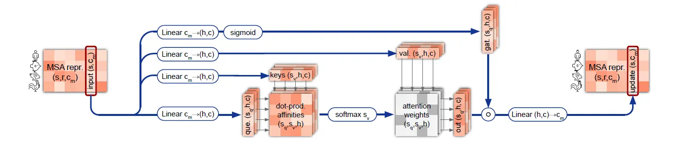 (Standard self-attention) Single MSA representation을 이용하여 standard self-attention (query-key-value)을 수행하여 udpate할 수 있을 것이다. (아래 그림, red highlight)