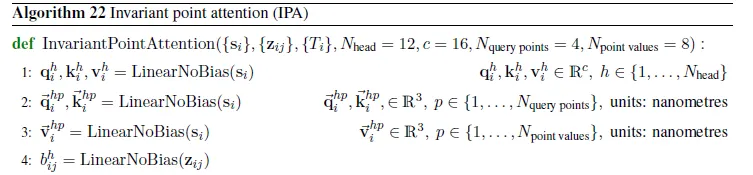 보다 구체적으로 설명하자면 아래와 같다. Single MSA representation의 column 를 적절히 linear projection시켜서 (LinearNoBias 연산 이용), backbone frame 상에서 적절하게 임의의 point 를 sampling할 수 있다고 생각해 보자. 다음 pseudocode의 2, 3번째 줄처럼 말이다. 이것의 의미는, amino acid residue의 위치 근처의 point를 3차원 공간 상에서 sampling한 것으로 생각하면 된다. (단, point를 나타내는 3차원 좌표계는 각 residue의 backbone frame을 이용한다.)