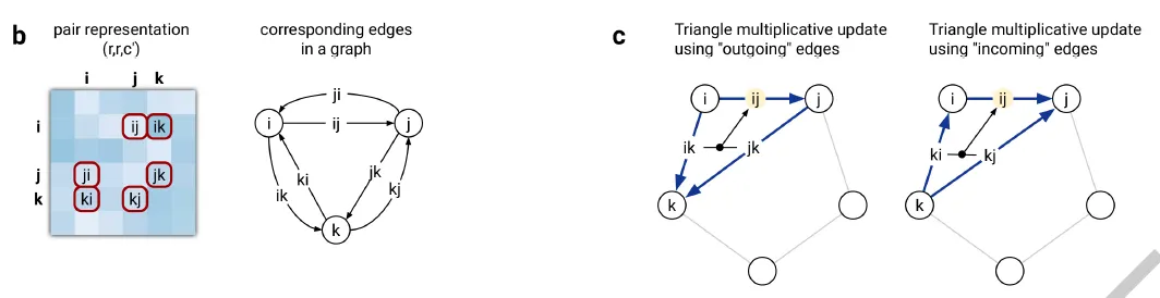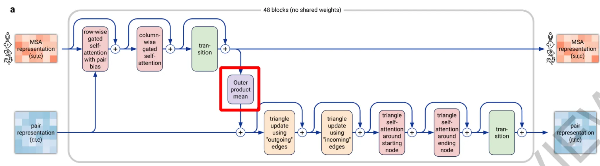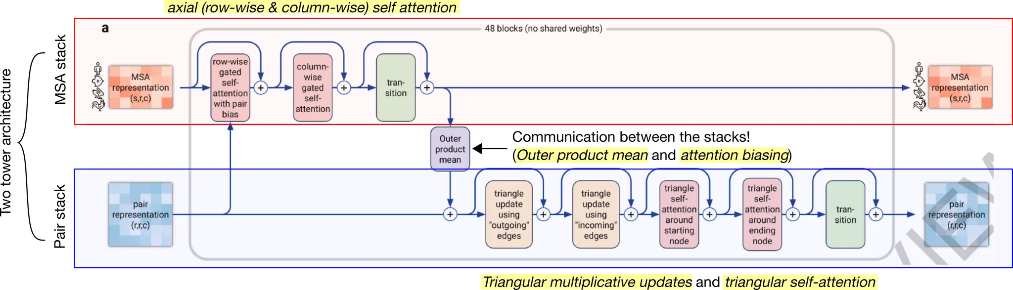 MSA representation과 pair representation의 information exchange/communication 을 통하여 evolutionary relationship과 spatial relationship을 상호보완적으로 반영시켜 MSA/pair representation을 update한다.