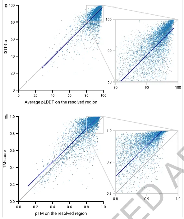 Fig 2c,d. (c) pLDDT와 lDDT-Ca가 잘 비례함을 알 수 있다. (d) 아래는 pTM 예측 또한 가능함을 보여주고 있다. 여기서는 다루지 않음.
