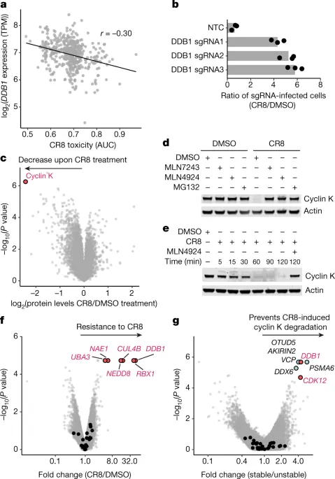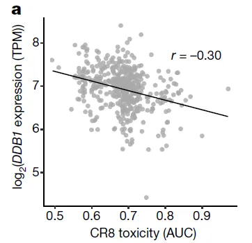 ← DDB1 (CUL4A adaptor protein; E3 ubiquitin ligase의 component) 발현량이 증가할수록 CR8 toxicity가 증가하더라. → 뭔가 CR8의 작용 기작이 E3 ubiquitin ligase와 연관되어 있을 것 같다.