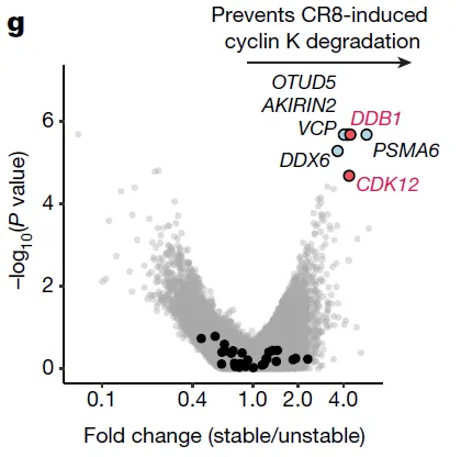← 같은 방식으로 genome-scale CRISPR screening을 수행하여 CR8-induced cyclin K degradation 에 필요한 유전자가 무엇인지 확인함.