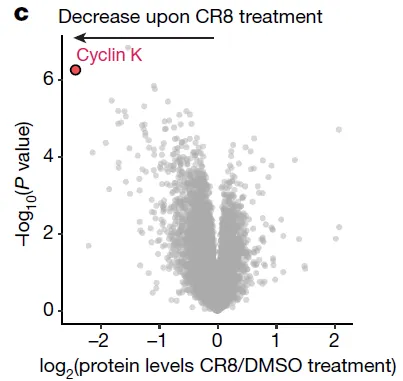 Whole-proteome quantification을 통해서 CR8 처리시 Cyclin K 단백질 수준이 감소함을 확인.