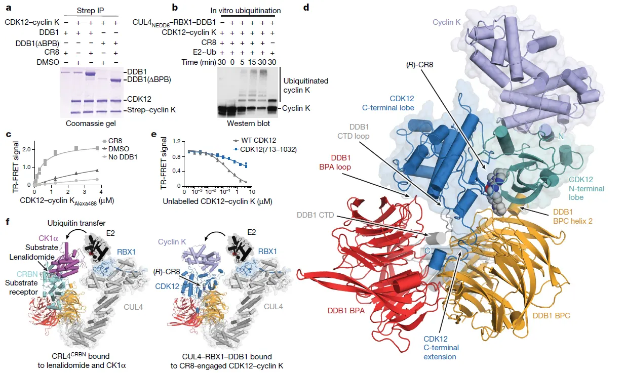 a) Co-IP 분석. DDB1과 CDK12-cyclin K의 결합에 CR8이 필요하다는 걸 알 수 있고, BPB domain이 없어도 DDB1이 CDK12-cyclin K와 결합 가능함을 알 수 있음.