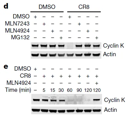 이런 compound 처리 시에 CR8이 Cyclin K를 분해하지 못하는 걸 보면 CR8의 Cyclin K 분해에는 E3 ubiquitin ligase의 작용과 proteasomal degradation이 필요하다는 걸 알 수 있음.