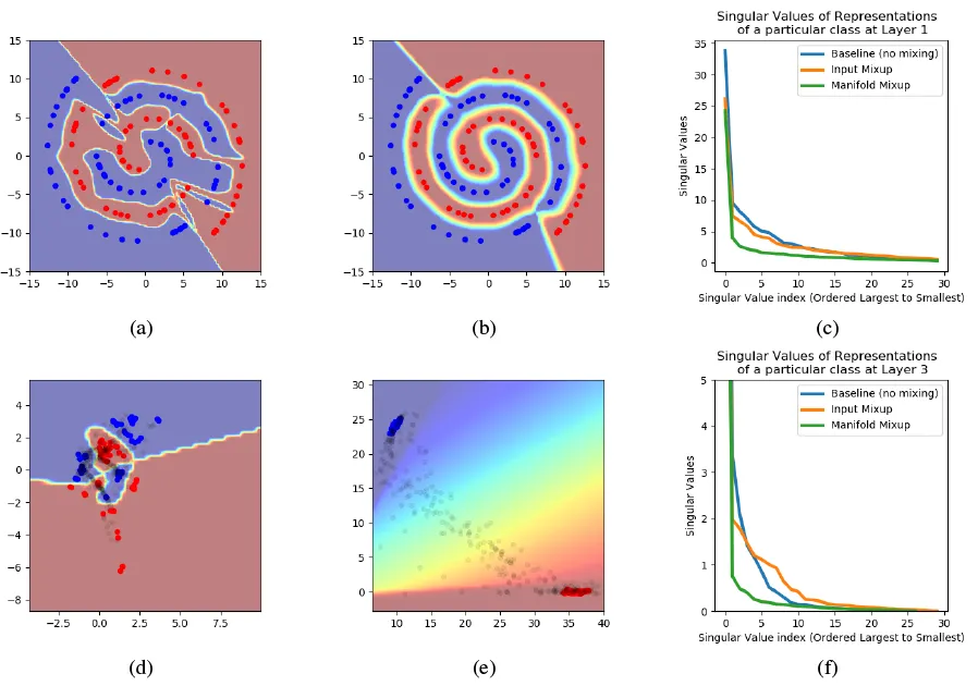 (a) Vanilla training 시의 decision boundary. (b) Manifold mixup 사용 시의 decision boundary. 더 smooth하다. (c) Layer 1의 representation들의 singular values. Manifold mixup representation들이 더 적은 representation으로 더 큰 데이터 variance를 설명하고 있다. (d) Vanilla training 시의 hidden representation. (e) Manifold mixup 사용 시의 hidden representation. (f) → (c)와 마찬가지.
