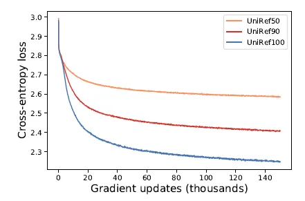 Clustering에 사용되는 similarity cutoff에 따라서 성능이 어떻게 변화하는지 봤더니, UniRef100 > UniRef90 > UniRef50 순으로 성능이 좋았다고 한다.