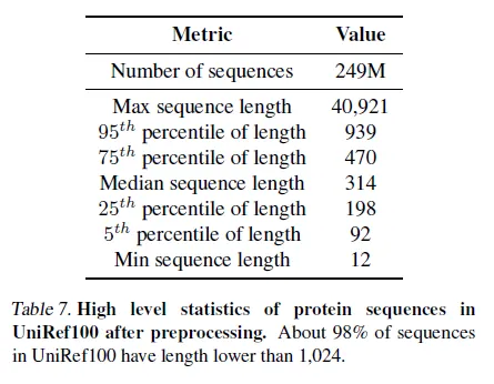 아래는 preprocessing 이후의 dataset statistics. ~2억 5천개 단백질 서열로 학습.