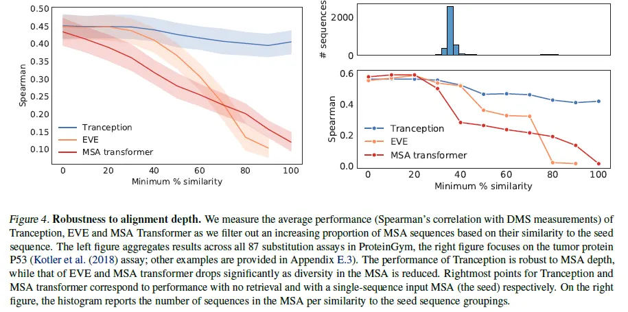 Sequence % similarity cutoff를 높여가며 MSA depth를 낮추면서 성능이 어떻게 변하는지 측정. MSA 기반의 방법과 비교하면 성능이 조금밖에 안 떨어진다.