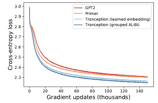 Grouped ALiBi를 사용하는 편이 learned embedding보다 파라미터 수도 적고, 수렴 속도도 빨라지는 것을 관찰했다.