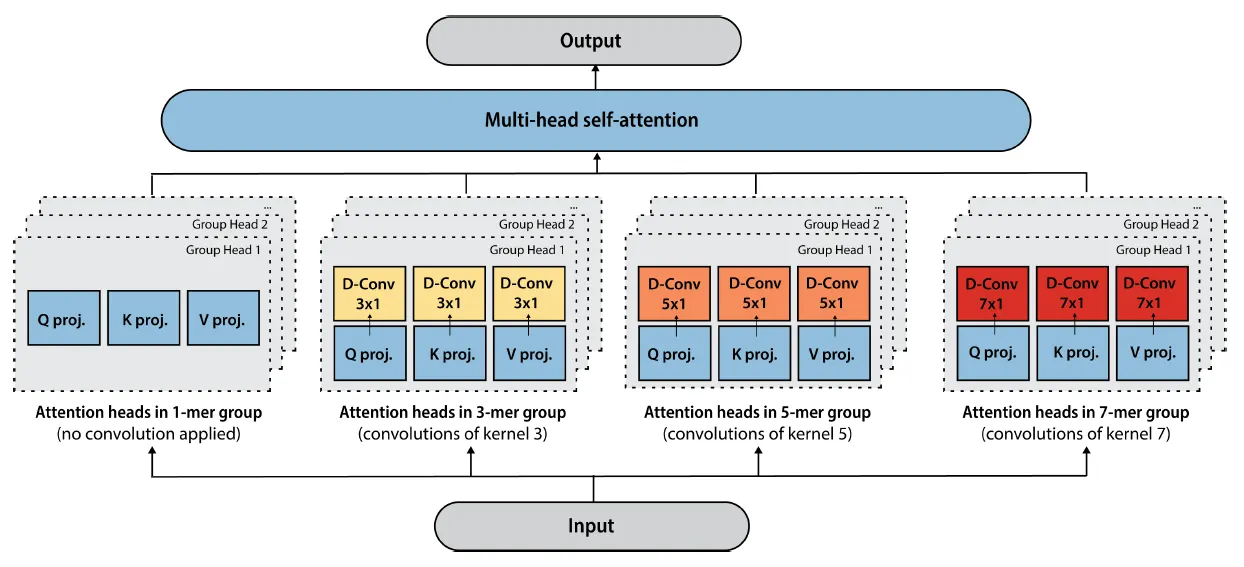 1-mer, 3-mer, 5-mer, 7-mer 단위로 convolution layer를 거친 후 attention을 수행한다.