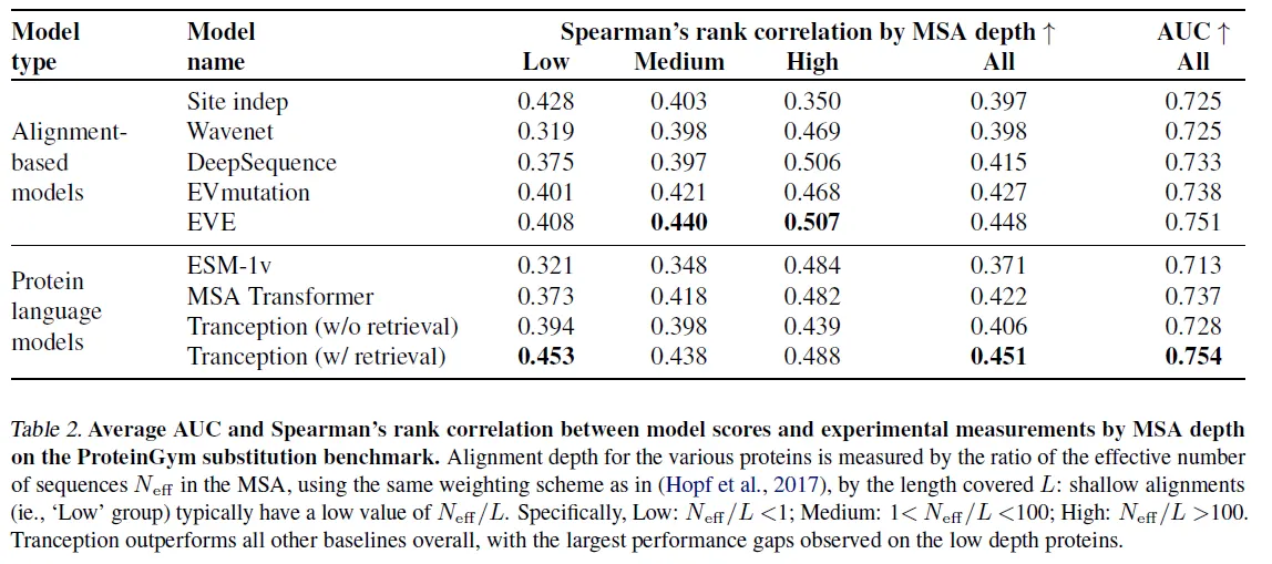 전체적으로 성능 향상이 있으며, MSA depth가 낮을 때 Alignment-based model보다 좋은 성능을 보임에 주목.